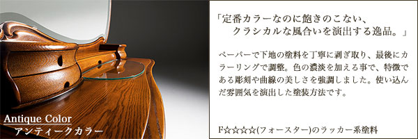 刷毛やガンを巧みに駆使して一本一本丁寧に塗り重ねる。塗装職人の熱い想いと修練された技で仕上ったアイ テムは、どれも味わい深い表情に仕上っています。塗装前の木地は同じでも熟練な塗装職人の手にかかれば、趣の異なったアンティークカラー・ホワイトカ ラー・ブラックカラーの世界観が出来上がります。