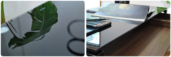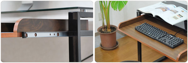 背面からみてもキレイな仕上げ。壁に背中をくっつけてデスクを配置する必要はありません。また、スライドトレーと天板のあいだに隙間があるのでキーボードやマウスのコードが通せるようになっています。 |