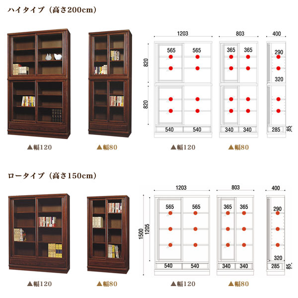 書棚はハイタイプ(高さ200cm)とロータイプ(高さ150cm)で幅は120cmと80cmの2種類。計4サイズから選んでいただけます。