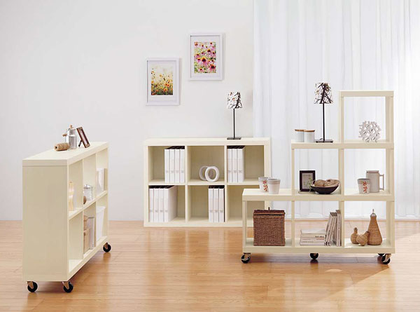 背板が無く、背面も化粧仕上げされているので気兼ねなくどこでも配置できるアイランド使用可。キャスターも付いているので移動させるのも楽です。お部屋の中央で間仕切りラックとしての使用も可能です。