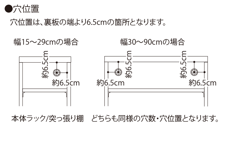 突っ張り棚のType23とType32は左右の側板に合計2箇所、Type41以上は左右の側板上下に合計4箇所穴加工がされます。
